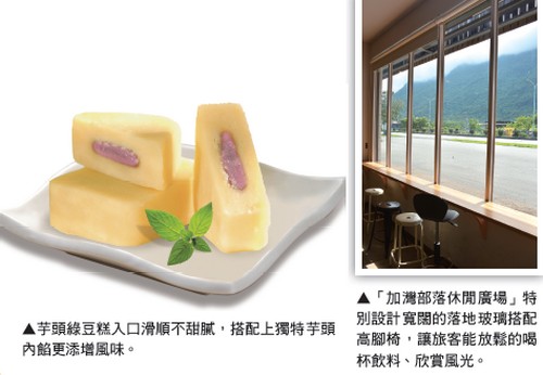 嚴選在地伴手禮 芋頭綠豆糕 成為最夯選擇對於許多人來說, 來到花蓮要購買伴手禮時,總是第一個想到麻糬,但其實盛產農產品的花 蓮,還有許多加工後的農特產品值得關注。 其實芋頭也是花蓮的特產之一,其中尤以吉 安鄉為台灣的芋頭產地,大部分為水芋栽 培,以檳榔心芋為主要品種,而這裡生產出 的芋頭因質地細緻且粉質高、香氣濃郁、口 感絕佳,品質不輸大甲芋,因而成為市場上 的搶手貨,更被列為「吉安三寶」之一。也 因此,「加灣部落休閒廣場」特別新增了花 蓮在地生產的芋頭綠豆糕,糕點入口滑順不 甜膩,搭配上獨特芋頭內餡更添增風味,因 而成為近期到訪「加灣部落休閒廣場」的旅 客,搶先購買的第一首選。