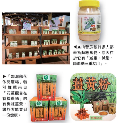 除了紅薑黃外,山苦瓜也是「加灣部落 休閒廣場」近期的主打明星產品,同樣來自 「花蓮觀自在有機農場」的山苦瓜,是由老 闆林瑞鵬以有機方式用心的栽種,不僅廣獲 好評,更於2013年榮獲台灣農業奧斯卡─神 農獎的殊榮,顯示出其商品品質值得放心。 「加灣部落休閒廣場」特別引進「花蓮二號 山苦瓜果茶」、「花蓮二號山苦瓜果粉」、 「花蓮二號山苦瓜乾片」等,讓民眾能購買 到最安心且最具功效的山苦瓜系列商品,好 好消暑一番。