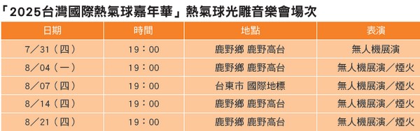 台東縣政府表示,活動將持續至8/21止(每週二為公休日),每天上午05:30至07:00及下午17:00至18:30,2個時段不僅可以看到來自海內外的造型球展演,還有機會可以購票搭乘熱氣球繫留體驗,接下來還有多場熱氣球光雕音樂會,陸續在鹿野高台、池上大坡池及市區國際地標登場,場場精彩,其中鹿野高台主場演出更將結合無人機進行聯合展演。同時台東縣政府也特別提醒,熱氣球光雕音樂會當日不僅可從鹿野火車站、台東市區搭乘接駁車及台灣好行縱谷鹿野線班次,也可採用共乘計程車方式抵達;而自行開車的民眾,現場也有民間停車場與在地商家的消費購物停車場可使用,歡迎多加利用。詳細活動及交通資訊,請至2025台灣國際熱氣球嘉年華的官方網站及社群平台查詢,掌握最新資訊,一起相約台東,嗨翻整個夏天!