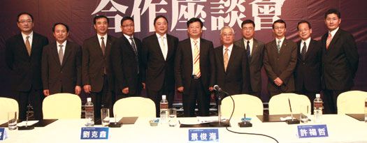▲(左起)旅行公會總會執行秘書長向權宗、陜西省台辦副主任王康、陜西省旅遊局副局長郜家福、東南旅行社同業行銷事業本部協理王士豪、雄獅旅行社總經理劉文義、陜西省人民政府副省長景俊海、華航台灣地區處長余劍博、華信航空執行副總經理史衢生、華信航空公關主任徐正