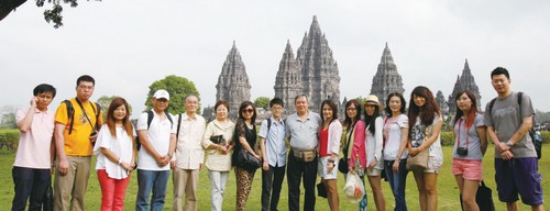 ▲(左7)印尼航空台灣區業務經理凌琍珍帶領台灣業者於世界遺產普蘭巴那印度廟前團照,(右1)TMS branch manager David Fu。