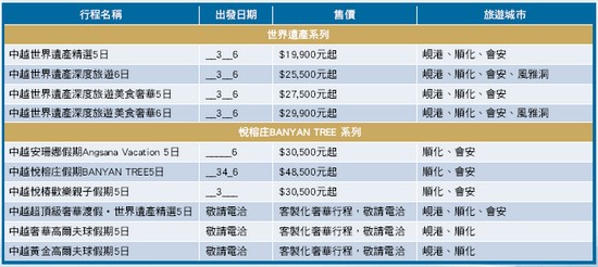 中越產品以世界遺產和頂級住宿兩大系列為行程主軸。「世界遺產」系列行程搭配越航天天出發,搭配河內胡志明市─峴港,旅客可彈性調整航點與時間。