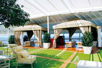 2.聖殿成人休憩區位於16樓前艙處,位置隱密幽靜,這裡有無遮蔽的日光浴區,也有人工綠蔭及專人SPA區。營業時間分為半日的8:00~12: 30、13:00~17:30,要價美金20元;也可選擇一整天閒適地在此度過,全日價則為美金40元。
