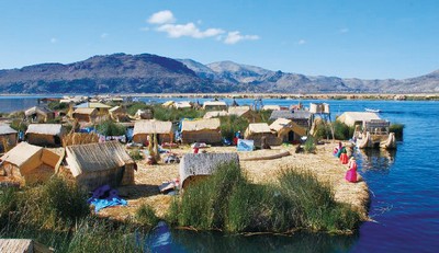 ▲搭遊艇參觀的的喀喀湖中由印地安漁民以蘆葦編製成的水上浮島~烏洛島