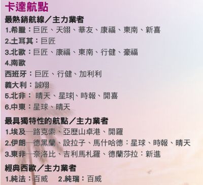 從台灣出發的旅客,可以透過台北、 台中、高雄3地出發至香港的航班,銜 接每日早晚各1班的香港─杜哈航線, 卡達亦提供香港出發行李一掛到底的 服務,經濟艙可掛1件30公斤行李的服 務。目前台灣市場使用量最多的,即為 透過卡達航空在歐洲布局的近40個航 點,包裝旅遊產品,其中又以北歐、東 歐、雅典的需求量最大。值得一提的 是,全新的哈馬德國際機場已於5╱27 啟用,斥資4,600億台幣建成,卡達航空 所屬的Al Mourjan提供商務艙以上旅客使 用;經濟艙旅客也可以加價USD40元享 受最高6小時的Oryx Lounge的服務。