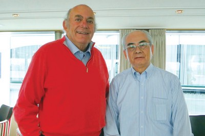 ▲金龍旅遊董事長沈鵬溶與塔克旅遊Chairman-Mr.Arthur.TauckJr在塔克河輪上合影。