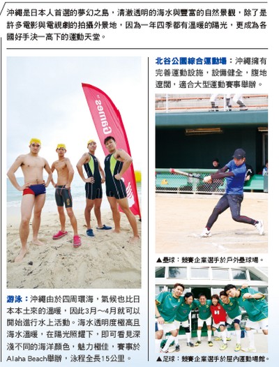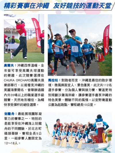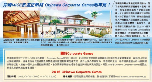 沖繩旅遊局於3/5~3/9舉辦2015 Okinawa Corporate Games媒體團考察,主力推廣此一年度 國際盛事,Corporate Games活動創辦於1980年,已於 世界各地舉辦過多場跨國企業運動競賽,此次2015 Okinawa Corporate Games參賽選手為各國企業推派代 表至沖繩參賽,推派參賽選手人數不限,運動項目分 別為高爾夫球、馬拉松、游泳、划龍舟、羽毛球、排 球、籃球、壘球等13個競賽項目,透過個人競賽及團 體積分制評選出優勝者與優勝企業,從今年起將連續 三年於沖繩舉辦。