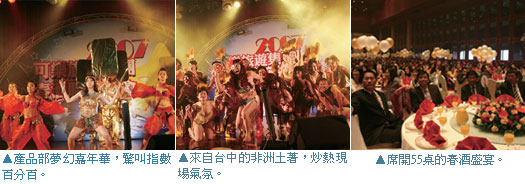 晚會從策劃、籌備、主持到表演,全部由員工自行擔綱,在公司慷慨的補助與獎勵之下,各部門無不出奇制勝,使出渾身解術,各自準備秘密武器,使得節目非常精采有看頭。