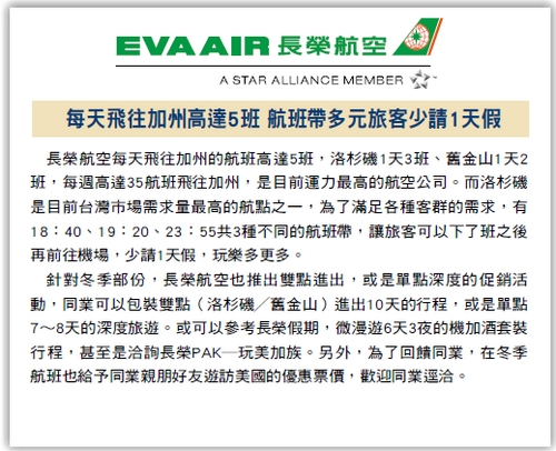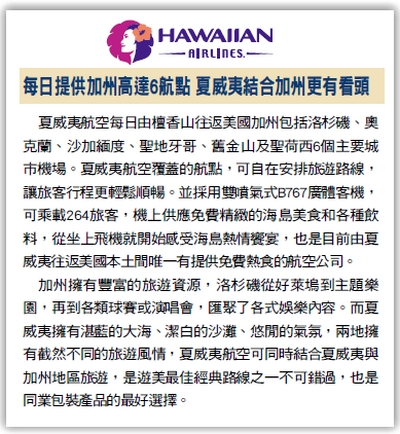 美國政府公布2014至2018 年5年內美國預估訪美國家前20名,台灣因免簽效應位居第20名。2013年赴美旅遊的台灣旅客超過36萬人,與 2012年比較成長約35%,預期 2015年將達到58萬5千人前往美國旅遊,其中有超過半數的遊客是前往加州,是加州最重視的海外市場之一。加州旅遊局台灣地區總監蔡璧如表示:「加州旅遊是一個成熟市場,在會議過程中見到同業先進有很多創意的行程構想,擁有滿腔熱血將計劃付諸行動,我們也非常期待彼此間的高度合作。」除此之外,加州旅遊局也歡迎提供合作方案,鼓勵供應端提供優惠,像是提供遊樂園、景區的門票優惠,加強淡季推廣,藉以刺激市場並吸引更多遊客前往加州。