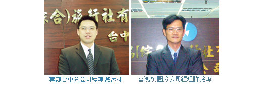 喜鴻旅行社台中分公司經理戴沐林表示,為了加強各地區的區域性銷售,於2006年4月成立的台中分公司,雖然以銷售總公司的產品為主,但為了更貼近廣大的台中地區消費族群,台中分公司也具備有自我設計產品行銷之能力,藉以更深耕中部地區市場。