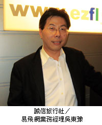 遠東航空(台北/濟州/上海)每日5班前往上海,全程(含由濟州轉機)只需4小時,省時度百分百!誠信旅行社/易飛網經理吳東豫表示,以台北來說,遠東航空加上東方航空,由台北經濟州轉往上海,在濟州機場等候飛機最長不過50分鐘,是市場上最省時的安排。除此,誠信旅行社還精選當地精緻飯店,提供同業們最完整的服務。面對2008北京奧運與2010上海世博會,大陸市場發展將拉起長紅,吳東豫建議同業們應該要積極佈局,才能適時進場、輕鬆獲利。在競爭激烈的航旅產業中,以遠東航空由台北到濟州航線為前段,東方航空由濟州飛往大陸地區為後段,這樣的安排讓旅客輕鬆前往大陸許多重要城市,除了北京與上海之外,還有哈爾濱、大連、瀋陽、杭州等。吳東豫希望藉此優質的航線與精緻飯店代理,要與同業分享「有房、有位」最有保障的獲利資源。(撰文>黃美珣 攝影>郭昭志)