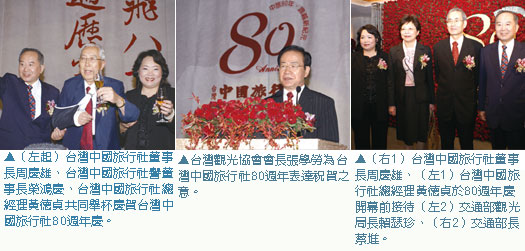 台灣中國旅行社成立80週年,當初中國旅行社創辦人陳甫光先生,只本著「與人方便」的想法就創辦了中國旅行社,沒想到這一本初衷也就走到了第80個年頭,熱鬧的80週年慶,特別邀請交通部長蔡堆、交通部觀光局長賴瑟珍、台灣觀光協會會長張學勞、香港中旅集團執行董事兼總經理盧瑞安共同參與盛會,台灣中國旅行社譽董事長榮鴻慶更是遠從香港搭機來台,慶賀台灣中國旅行社的80週年慶。