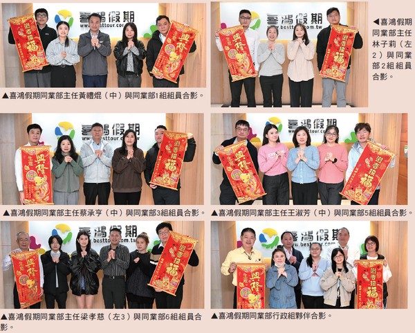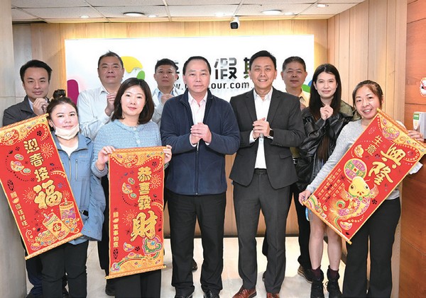 ▲喜鴻假期副總經理陳東隆(前排左4)、同業部協理高緯紹(前排左3)與同業部主管恭賀同業夥伴馬年發發發。