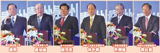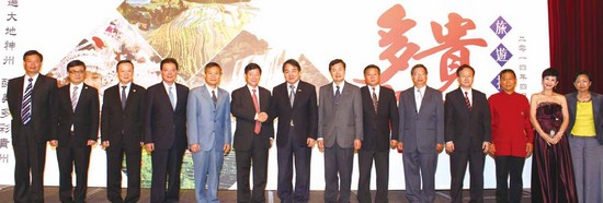 ▲(左起)中國南方航空董事總經理馮華南、貴州省政府新聞辦公室副主任哈思挺、貴州台黨委書記白芳芹、高雄市觀光協會理事長黃金祥、海旅會高雄辦事處主任李建平、貴州省政協主席王富玉、交通部觀光局長謝謂君、高雄觀光局局長許傳盛、貴州省旅遊局局長傅迎春、品保協會副理事長陳善國、副理事長楊賢能、台灣長河博物館館長黃英峰、主持人李秀媛。
