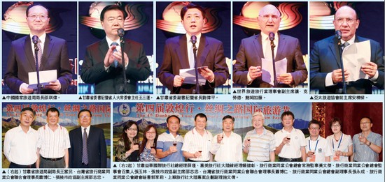 分圖片/甘肅省旅遊局、張掖市旅遊局、張林濤 第四屆敦煌行•絲綢之路國際旅遊節以「暢遊絢麗甘肅、發展絲路旅遊」為主題,6/15在甘肅省張掖市隆重揭幕,甘肅省委書記暨省人大常委會主任王三運、中國國家旅遊局局長邵琪偉、甘肅省省長劉偉平、世界旅遊業理事會副主席鮑姆加藤、亞太旅遊協會前主席安棟樑出席並致詞;台灣由旅行商業同業公會總會理事長許禓哲受邀組團前往共襄盛舉。