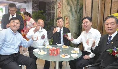 ▲(左起)海旅會秘書長劉克智、山東省旅遊局局長于衝、高雄市觀光局局長許傳盛、海旅會執行會長杜江、東南旅遊總經理李清松一同品嘗青島啤酒。