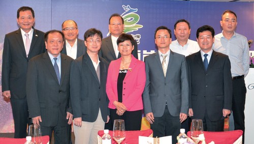 ▲(前排左起)台灣國際郵輪協會理事長吳勛豐、觀光局國際組秘書伍哲宏、大豐市委政法委員會書記袁國萍、海旅會台北辦事處主任助理陳鴻傑、大豐市旅遊局局長陶聳;(後排左起)大登旅行社董事長林博宗、新進旅行社總經理方世宗、上順旅遊董事長李南山、旅行公會總會副理事長莊世忠、大豐市旅遊產業招商局局長袁偉。