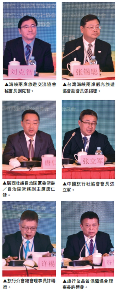 此次包括廣西壯族自治區黨委常委/自 治區常務副主席唐仁健、海峽兩岸旅遊交 流協會秘書長劉克智、台灣海峽兩岸觀光 旅遊協會副會長張錫聰、中國旅行社協會 會長張立軍、旅行業品質保障協會理事長 許晉睿、旅行公會總會理事長許禓哲等皆 出席並致辭。