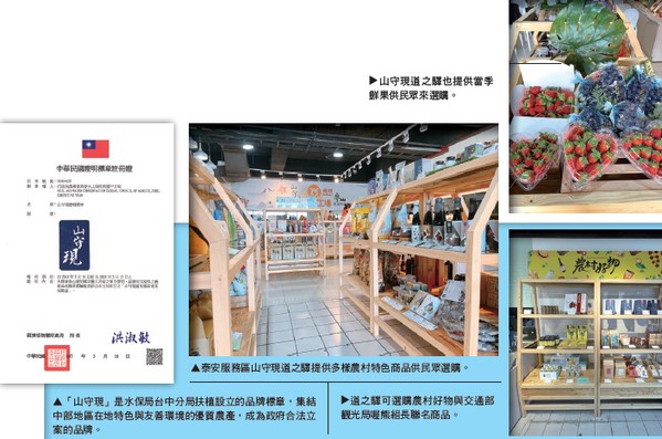 台灣山守現農村再生發展協進會理事長廖明世表示,「山守現」是水保局台中 分局扶植設立的品牌標章,集結中部地區 在地特色與友善環境的優質農產,並透過 「道之驛」、「直賣所」等服務據點,與 中台灣農村旅遊相輔相成,在農村體驗產 業、在山守現據點選購優質農產品,方便 遊客採購也強化品牌推廣。