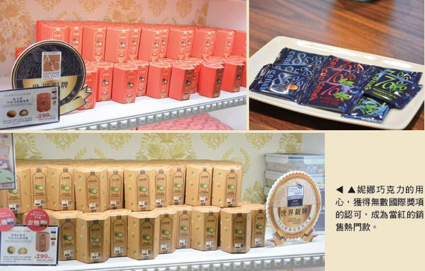 即使成本倍增,毛利下降,但對於妮娜巧克力而言,希望客人帶走的不只是一份巧克力,更是一份充滿溫馨的回憶。不僅如此,妮娜更走出南投、邁向國際。以融入在地食材,生產包括結合台灣南投在地的烏龍茶、鳳梨、荔枝等優質食材的鳳梨黃金葡萄乾巧克力、炭焙烏龍茶巧克力夏威夷果、70%荔枝紅玉茶巧克力Bar等,不僅生產滿足台灣消費者味蕾的巧克力,更在國際評比中屢屢斬獲殊榮,為台灣美食發光發熱。
