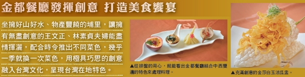 而對於王文正夫妻倆來說,除了金都的知名度提升外,他們也積極與國際化甚深的台北廚界交流,學習西方的擺盤等方式,並融入當地食材,成功將料理深化到層次。