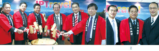 1.(左起)華信航空營業部營業經理周育志、立榮航空營業本部台北營業部經理林耀熙、佳品總經理許宏亮、日觀所所長井久保敏信、全日空總經理藤野未成、喜美副總經理林廉駿。2.(左起)佳品副總經理羅國華、總經理許宏亮、副總經理李道珩。