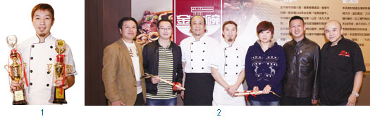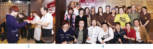 1.金大碗台灣牛肉麵店長翁加恩。2.金大碗台灣牛肉麵老闆翁萬寶(左1)、店長翁加恩(左4)、板橋皇家牛肉麵老闆陳家斌(右1)、中華美食交流協會理事長阿發師(左2)。3.兩位來自中國吉林省的學徒特別前往台灣,向金大碗台灣牛肉麵的師傅拜師學藝,學成之後再回到大陸把台灣牛肉麵發揚光大。4.金大碗台灣牛肉麵團隊,致力提供旅遊團安全衛生、真材實料、新鮮美味的用餐環境。