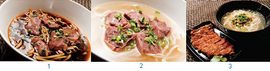 1.紅燒牛肉麵。2.清燉牛肉麵。3.香酥排骨麵。