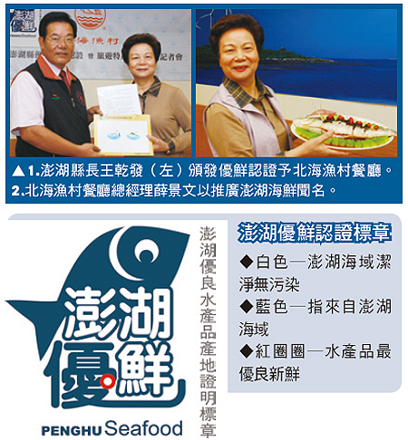 澎湖海鮮美味知名,為了替消費者把關,確認來源、保障品質,澎湖縣政府以「澎湖優鮮」標章作為辨識,繼縣內5家餐廳業者獲頒通路認證後,縣長王乾發更特地趕赴台北頒發「澎湖優鮮通路認證魚種公告欄」予通過通路認證北海漁村餐廳。王乾發強調,「澎湖優鮮」是目前全國唯一獲水產品認證的標章,消費者可認明品牌,吃得安心又健康。本次另有天和鮮物、湧升海洋與台北日本居酒屋等3家業者亦獲得認證肯定。