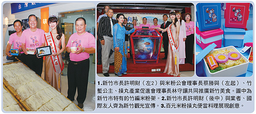 世博台灣館落腳新竹市,園區雖仍處於招商階段,但是新竹市特有的地方文化美食活動持續熱鬧登場。新竹市長許明財表示,2011年的百年新竹米粉摃丸節很科技很食尚,不僅米粉與摃丸業者全力動員,推廣美食,更與遠傳電信、交通大學師生、傳動數位與大輿資訊合作,開發出「遠傳行動導航APP─新竹米粉摃丸節」智慧服務,透過APP,即時掌握各項活動節目、好康優惠,更透過行動導航功能,帶領遊客探索米粉摃丸源頭,發現30家新竹重量級業者的隱藏景點。科技、傳統美食與歷史人文的結合,帶來城市觀光的新創意。