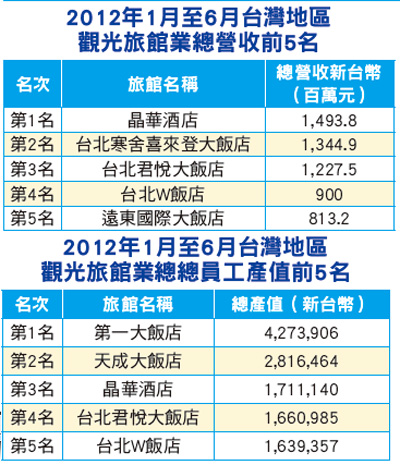 交通部觀光局統計今年上半年來台人數達358 萬人次,較去年同期成長25.24%,帶動觀光旅館業營運績效表現不錯,2012年上半年觀光旅館業客房總平均住用率為68.08%,與2011年同期65.73%比較,增加3.07個百分點,其中花蓮地區增加9.06個百分點,居各地區之冠。營收也同步成長,2012年上半年觀光旅館業總營收為 257.47億元,較去年同期增加15.85億元,成長幅度為6.55%。