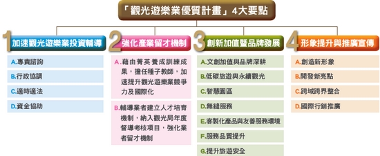 環節包括1.從軟體到硬體、從設施到服務都達到優質化目的;2.透過政策輔導業者辦理人力品質提升、服務設施修繕、遊客接駁服務及創新服務措施等事項,提升觀光遊樂業高品質的接待能力。
