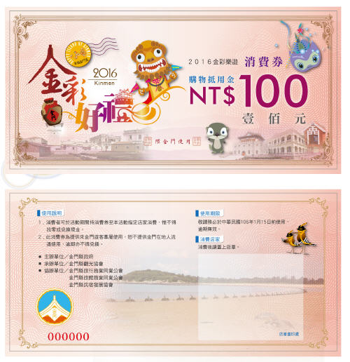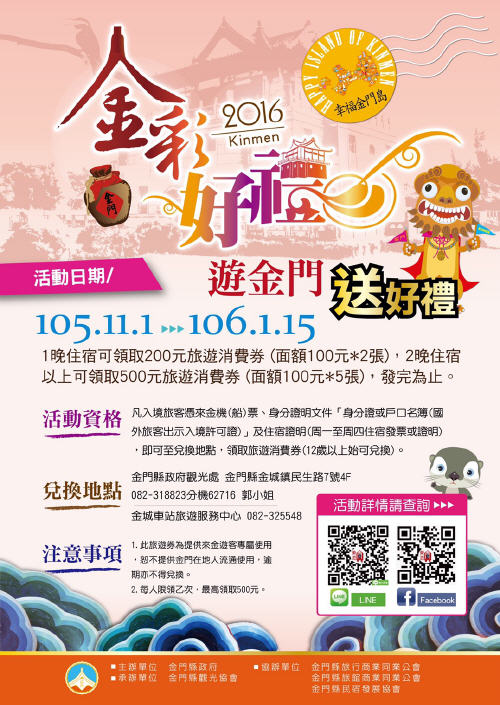金門縣11月起發行2016金彩樂遊消費券 鼓勵旅客遊歷金門創造消費帶動經濟活絡