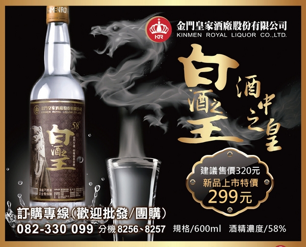 皇家酒廠今年同步推出「白酒之王」全新款白酒,遵循傳統古法製作,尋香釀造,盡心竭力朝向「白酒之王,酒中之皇」的品牌地位;白酒之王不僅名字取得霸氣,4個字樣經設計結合在一起成為「皇」字,展現力拼白酒市場第一的野心。