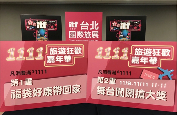 台灣觀光協會表示,將推出「1111旅遊狂歡嘉年華」活動,特別邀請超人氣的喔熊組長一同宣傳本次旅展的精采內容,更祭出展場限定1,111元滿額福袋禮、舞台闖關搶大獎活動,眾多參展單位將於11/9~11每日11:11推出限時限量1元或1.1折商品,邀民眾一起來旅展歡慶ITF旅遊盛會。