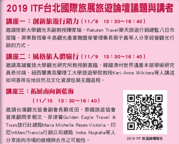 由台灣觀光協會主辦,全台旅界最高度關注、規模最大「2019ITF台北國際旅展(Taipei International Travel Fair)」將於11/8~11於南港展覽館盛大登場。將近60個國家地區,遠至中南美洲的阿根廷、巴西、大洋洲的索羅門等地皆來台再次參展,齊邀民眾參與這場全亞洲參觀人數最多、全台最大型的展銷合一旅遊展覽。
