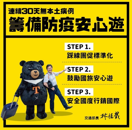 交通部部長林佳龍表示,台灣已經連續30天沒有肺炎本土病例,代表民眾的防疫意識下已經讓台灣相對安全,因此交通部特別責成觀光局,開始針對國民旅遊市場進行著力,由於「推動旅遊,便要從國旅開始」,因此將先推動國旅市場的防疫旅遊,透過踩線回饋的意見,在防疫全面解禁之前,先建構起一套標準SOP規範,提供全民參考。