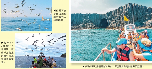 東海開發育樂╱彭博旅行社張忠華表示,目前推出2款行程:白猿坑東海半日遊和白猿坑東海巡航海鮮BBQ,將帶旅客前往東海無人島巡航,探索錠鈎嶼玄武岩壯麗景觀和雞善嶼餵食燕鷗,欣賞上千隻燕鷗海面飛翔的壯觀畫面,航程約70分鐘。