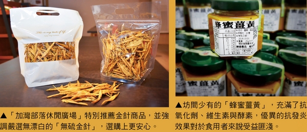 由於金針花含豐富維生素A、B1及鈣等,有助維護視力與上皮細胞完整,兒茶素與沒食子酸則有高抗氧化效果,而尤其是蘆丁和橙皮苷,則能發揮類似抗憂鬱的效果。因此「加灣部落休閒廣場」特別推出金針相關系列商品,並強調嚴選無漂白的「無硫金針」,選購上更安心。