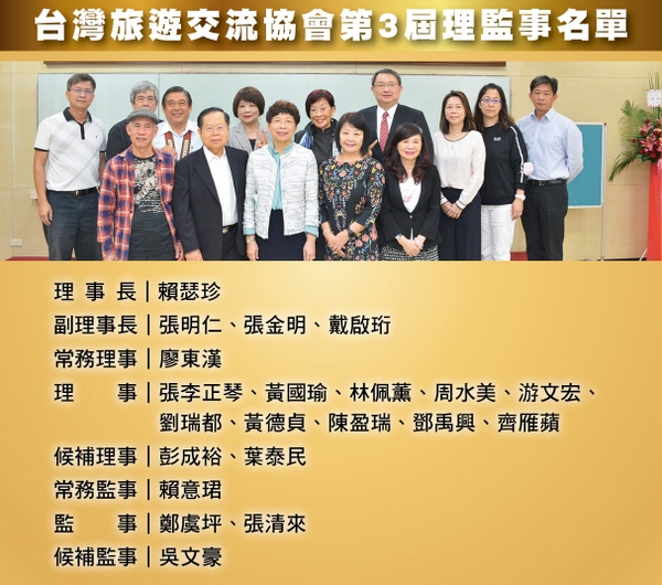 而隨著第2屆的理監事團隊服務任期結束,台灣旅遊交流協會於9/30舉辦第3屆首次會員大會,並投票選舉出新的服務團隊,而第2屆盡心盡力服務與推廣的理事長賴瑟珍,也在會員與新任理監事團隊的一致推崇下,連任理事長一職,期許在未來的任期中,再協助台灣觀光產業帶來質變。