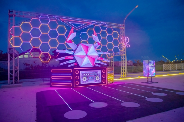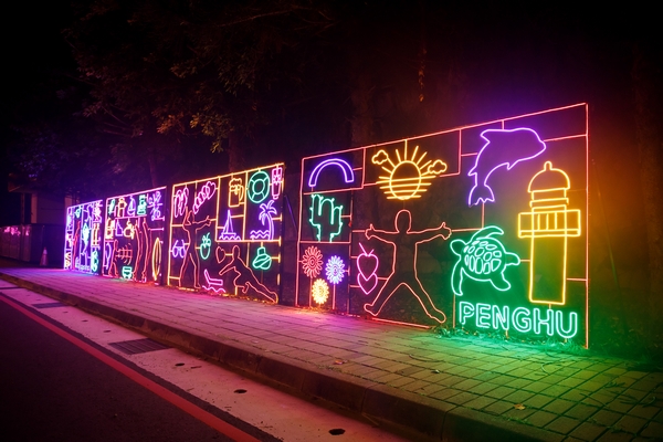 今年璀璨精彩的燈飾也是絕不可錯過的亮點,在主題燈區中的「海島崛起」作品,是本次的焦點之一,以網狀材料拉塑成有高低點的島型漂浮式網狀裝置藝術,同時結合了澎湖在地創作藝術家─鄭美珠老師的畫作「漂浮之島」,大幅度地展現了澎湖在地特色風景地貌。