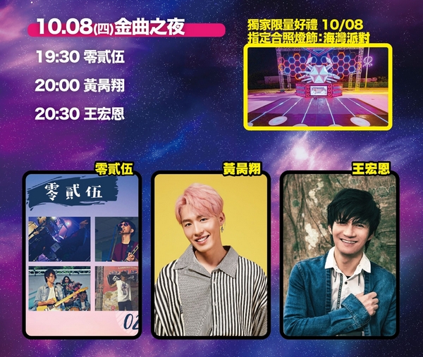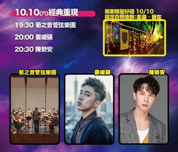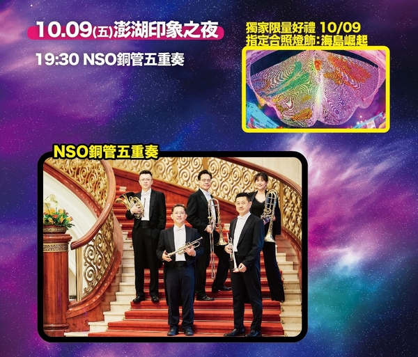10╱8「金曲之夜」邀請到曾獲得金曲獎最佳演唱組合獎的黃昺翔,以及得過2次金曲獎的原住民靈魂歌手王宏恩,10╱9則是邀請國家交響樂團NSO銅管五重奏,今年的4場巡迴演出唯一離島,就特別安排在澎湖燈光節舞台,邀請專業舞者、國內知名聲樂家與NSO銅管聲部音樂家同台,藉由輕鬆的講解,輔以音樂家與舞蹈家現場精彩演出,拉近與大眾之間的距離。