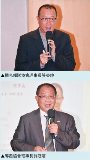 ▲(左起)中華優質旅遊發展協會理事長李奇嶽、桃園市旅行公會理事長呂中豪、觀光領隊協會理事長張榮坤、台南市旅行公會理事長蘇榮堯、旅行公會全聯會副理事長張永成、旅行業品質保障協會理事長許禓哲、交通部觀光局副局長林信任、交通部常務次長祁文中、旅行公會全聯會理事長蕭博仁、省聯合會理事長張東周、台中市旅行公會理事長張進丁、高雄市旅行公會理事長吳盈良、嘉義市旅行公會理事長賴俊杰、澎湖縣旅行公會理事長謝光富。