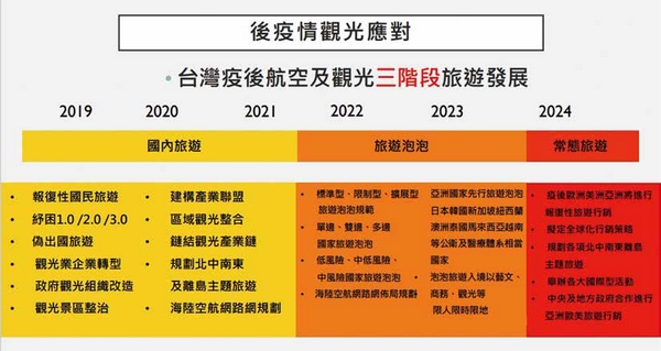 而當各國疫情控制穩定後,預計2022、2023年開始進入「旅遊泡泡」階段,旅遊泡泡亦可分標準型、限制型、擴張型,發展出從單邊、雙邊到多邊的旅遊泡泡選擇。而開放國家應先由短航程的亞洲國家開始,包括日韓、新加坡、紐澳、泰國、馬來西亞、越南等公衛及醫療體系相當國家為優先開放的對象,以限人、限時、限地的方式,提供藝文、商務、觀光等需求。
