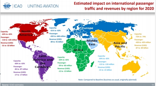前台中市觀光旅遊局局長、中華科技大學航空運輸管理研究所教授陳盛山表示,根據2020 ICAO預估:全球旅運量及營收損失慘重,亞洲及太平洋地區旅運量短少4億2,900萬人次,航運收入遽減890億美元,美洲歐洲亞洲各大航空公司分別面臨破產、關閉、裁員、資遣、減薪、無薪假等情況嚴重。
