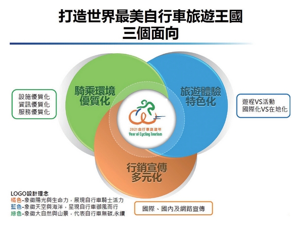 交通部長林佳龍表示,「人本交通」為本部最重要的施政方針,爰為建立台灣與自行車結合的品牌形象,交通部透過人、車、路及資訊4大面向,包括:自行車騎乘文化教育宣導、自行車多元體驗虛擬共騎、自行車路網系統建設及食宿遊購行資訊整合,並結合在地組織、產業聯盟、區域旅遊資源及特色,搭配便利的大眾運輸及豐富的活動與遊程,推廣自行車旅遊,並將自行車融入日常生活。