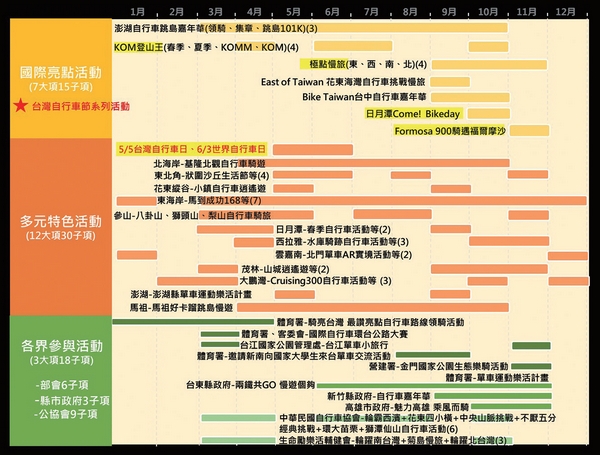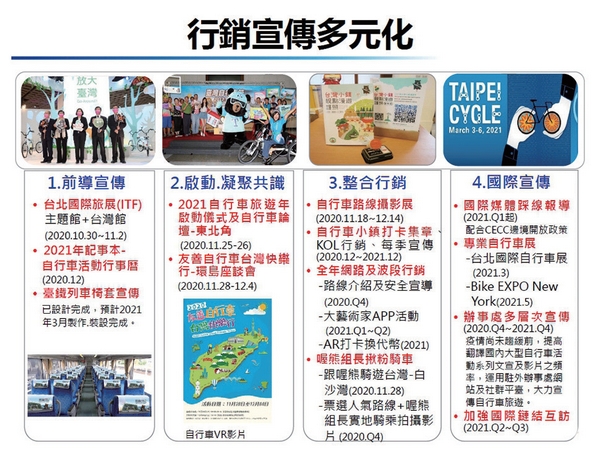 結合國際化與在地化,融入離島體驗、運動競技、親子共遊、產業市集、休閒樂活、身障騎遊等元素。交通部觀光局2020年已核定補助民間團體、地方政府及國家風景區管理處自行車活動合計4,660萬元。
