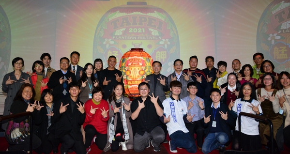 ▲2021台北燈節卡司陣容合影,台北市政府觀光傳播局劉奕霆局長(右4)與九天民俗技藝團、董事長樂團、、白安、魏嘉瑩、Jamii_Szmadzinski合影。