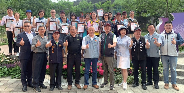 ▲南庄鄉是國際慢城之一,5月洋溢花香與藝術。(前排右2)苗栗縣觀光局局長林彥甫;(右6起)苗栗縣長徐耀昌、參山國家風景區管理處代理處長曹忠猷;(前排左1)竹竹苗區域觀光聯盟總召江百松。