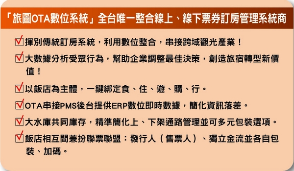 泰安觀止董事長江德利表示,旅客可以在飯店聯盟內或是「旅圖OTA數位系統」所有的飯店,自行打包購物車,成為專屬於自己的行程,包括每一天的飯店住宿、附加服務內容、當日套裝行程等,加上可以機動式調整,不僅旅客選擇更多元,也能藉此增加業者的銷售力道。